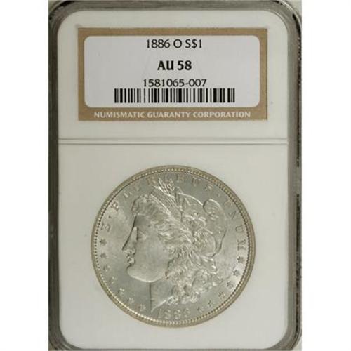 <B>1886-O $1 AU58 NGC.</B></I> NGC Census: (916/1225). PCGS Population (614/1636). Mintage: 10,710,000. Numismedia Wsl. Price for NGC/PCGS coin in AU58: $200. (#7168)<BR><BR><B>Coin Engraver:</B> George T. Morgan<BR><BR><b>Shipping:</b> Coins & Currency (<a target="_blank" href="http://www.heritageauctions.com/common/shipping.php">view shipping information</a>)