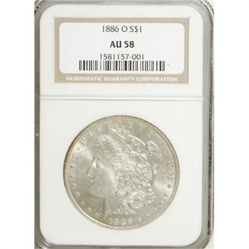 <B>1886-O $1 AU58 NGC.</B></I> NGC Census: (916/1225). PCGS Population (616/1661). Mintage: 10,710,000. Numismedia Wsl. Price for NGC/PCGS coin in AU58: $200. (#7168)<BR><BR><B>Coin Engraver:</B> George T. Morgan<BR><BR><b>Shipping:</b> Coins & Currency (<a target="_blank" href="http://www.heritageauctions.com/common/shipping.php">view shipping information</a>)