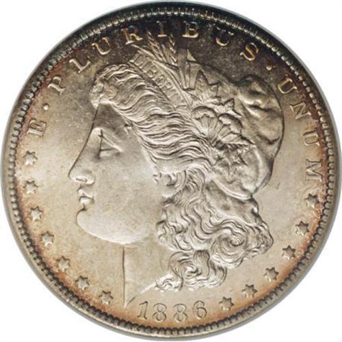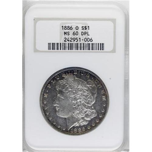 <B>1886-O $1 MS60 Deep Mirror Prooflike NGC.</B></I> The 1886-O is common in circulated grades, but Uncirculated pieces are elusive, and deep mirrored prooflikes are very rare. This attractive example has golden-brown and champagne-rose peripheral toning. Marks are inconsequential for the MS60 level, and the strike is good for an '86-O. Encapsulated in a prior generation NGC holder. Census: 2 in 60 DMPL, 6 finer (6/07).<BR><I>From the Diamond Head Collection.</B></I><BR><BR><b>Shipping:</b> Coins & Currency (<a target="_blank" href="http://www.heritageauctions.com/common/shipping.php">view shipping information</a>\)