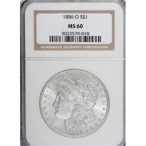 <B>1886-O $1 MS60 NGC.</B></I> . NGC Census: (147/1123). PCGS Population (184/1578). Mintage: 10,710,000. Numismedia Wsl. Price for NGC/PCGS coin in MS60: $475. (#7168)<BR><BR><B>Coin Engraver:</B> George T. Morgan<BR><BR><b>Shipping:</b> Coins & Currency (<a target="_blank" href="http://www.heritageauctions.com/common/shipping.php">view shipping information</a>)