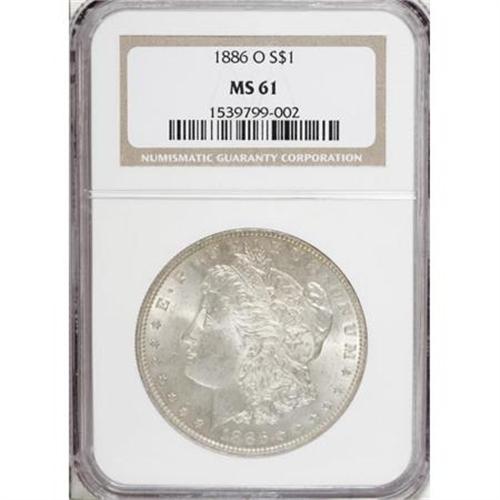 <B>1886-O $1 MS61 NGC.</B></I> An unworn and decisively struck example of this available O-mint issue, more appealing than the MS61 designation might suggest. A thin veil of rose-gold patina graces the faintly abraded surfaces.<BR><BR><B>Coin Engraver:</B> George T. Morgan<BR><BR><b>Shipping:</b> Coins & Currency (<a target="_blank" href="http://www.heritageauctions.com/common/shipping.php">view shipping information</a>)