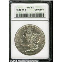 <B>1886-O<img border='0' src='http://www.heritagecoins.com/images/star.gif' width=10 height=10>$1 MS62 ANACS.</B></I> A sharply struck, lustrous, and nearly brilliant example. The reverse is well preserved, while a few moderate marks on the obverse limit the grade. One of the most conditionally scarce issues in the series, common in VG to XF but notoriously difficult in better Mint State grades.<BR><I>From The Richard J. Chouinard Collection of United States Coins, Part Three.</B></I>