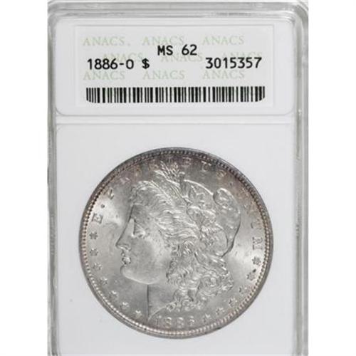 <B>1886-O $1 MS62 ANACS.</B></I> Whispers of light purple make occasional visits to the rims, and a suitable strike leaves well defined motifs. A few minute marks are noted on each side.<BR><BR><B>Coin Engraver:</B> George T. Morgan<BR><BR><b>Shipping:</b> Coins & Currency (<a target="_blank" href="http://www.heritageauctions.com/common/shipping.php">view shipping information</a>)
