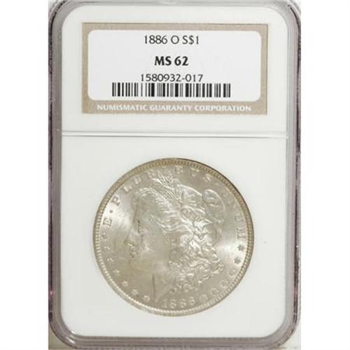 <B>1886-O $1 MS62 NGC.</B></I> Softly lustrous with delicate pastel-blue and peach patina over each side. The eagle displays strong detail, though the hair over the ear reveals a measure of softness. All in all, a pleasing example of this New Orleans Morgan dollar issue.<BR><BR><B>Coin Engraver:</B> George T. Morgan<BR><BR><b>Shipping:</b> Coins & Currency (<a target="_blank" href="http://www.heritageauctions.com/common/shipping.php">view shipping information</a>\)