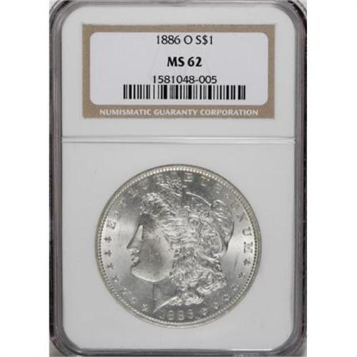 <B>1886-O $1 MS62 NGC.</B></I> Dots of milky patina visit the right reverse, and pale golden accents grace both sides of this unworn New Orleans Morgan dollar. The strike is solid overall, and the minor weakness at the hair above the ear is typical for the issue.<BR><BR><B>Coin Engraver:</B> George T. Morgan<BR><BR><b>Shipping:</b> Coins & Currency (<a target="_blank" href="http://www.heritageauctions.com/common/shipping.php">view shipping information</a>)