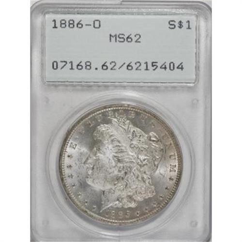 <B>1886-O $1 MS62 PCGS.</B></I> Lightly toned and lustrous with the usual indifference of strike at the centers. Clean aside from a cluster of wispy grazes on the cheek. Housed in a first generation holder.<BR><BR><B>Coin Engraver:</B> George T. Morgan<BR><BR><b>Shipping:</b> Coins & Currency (<a target="_blank" href="http://www.heritageauctions.com/common/shipping.php">view shipping information</a>)
