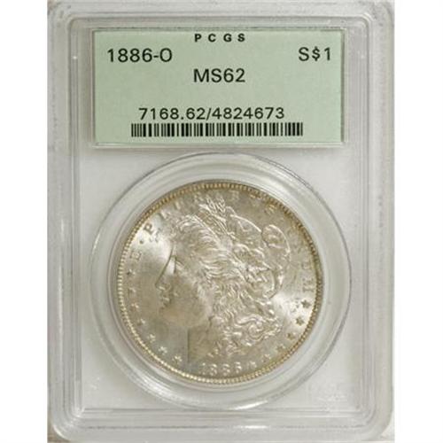 <B>1886-O $1 MS62 PCGS.</B></I> Crisply struck and lustrous for this difficult issue, and the reverse is well preserved. The cheek has faint grazes, and the back of the cap is moderately abraded. Encased in a green label holder.<BR><I>Ex: Mid-Winter ANA Signature (Heritage, 3/98), lot 6141.</B></I><BR><BR><B>Coin Engraver:</B> George T. Morgan<BR><BR><b>Shipping:</b> Coins & Currency (<a target="_blank" href="http://www.heritageauctions.com/common/shipping.php">view shipping information</a>)