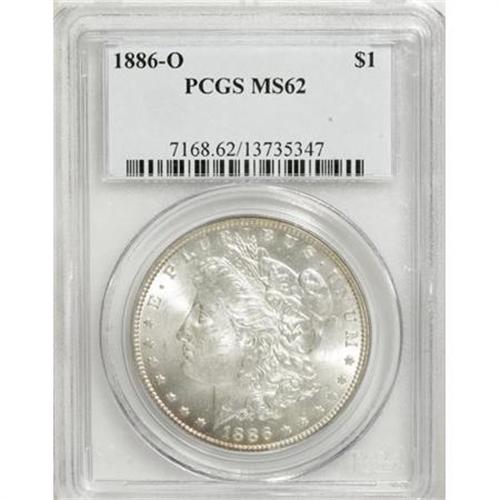 <B>1886-O $1 MS62 PCGS.</B></I> Lustrous and essentially untoned, except for faint plum color near the lower left obverse rim. Boldly struck and nicely detailed on the hair just above Liberty's ear, and on the eagle's breast feathers. Scattered small abrasions define the grade. <BR><I>From The Mario Eller Collection, Part Two.</B></I><BR><BR><B>Coin Engraver:</B> George T. Morgan<BR><BR><b>Shipping:</b> Coins & Currency (<a target="_blank" href="http://www.heritageauctions.com/common/shipping.php">view shipping information</a>)