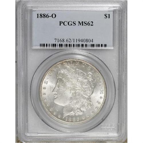 <B>1886-O $1 MS62 PCGS.</B></I> A fully lustrous and lightly toned example of this high mintage but conditionally rare issue. Pleasing for the MS62 level, since the surfaces are smooth aside from a solitary thin mark in the field near the nose.<BR><BR><B>Coin Engraver:</B> George T. Morgan<BR><BR><b>Shipping:</b> Coins & Currency (<a target="_blank" href="http://www.heritageauctions.com/common/shipping.php">view shipping information</a>)