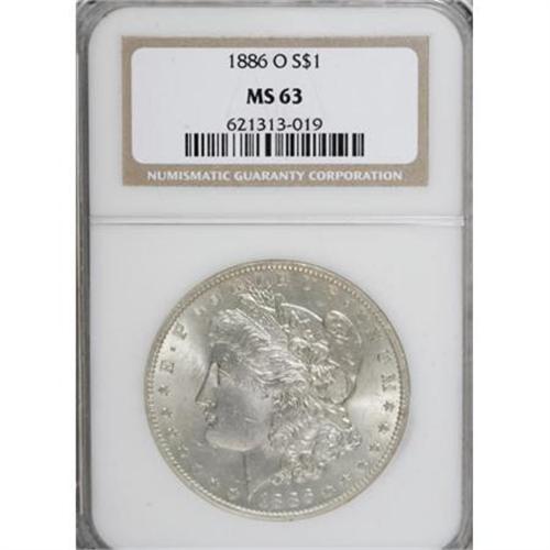 <B>1886-O $1 MS63 NGC.</B></I> Soft luster emanates from the color-free surfaces of this Select New Orleans representative, and an attentive strike imparts sharp definition to the design elements. Minute handling marks preclude a higher grade. Few of the 10 million-plus coins struck were apparently saved for numismatic purposes.<BR><BR><B>Coin Engraver:</B> George T. Morgan<BR><BR><b>Shipping:</b> Coins & Currency (<a target="_blank" href="http://www.heritageauctions.com/common/shipping.php">view shipping information</a>)