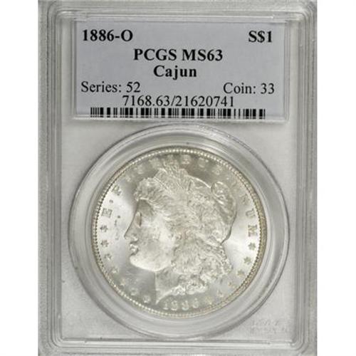 <B>1886-O $1 MS63 PCGS.</B></I> Ex: Cajun Collection. Bright luster adorns both sides of this Select O-mint, each of which is essentially devoid of toning. While the issue is usually weakly struck, the present example displays relatively sharp overall detail, including partial definition in the hair at Liberty's ear, and strongly impressed breast feathers. A few light marks account for the grade. David Bowers estimates that 6 to 8 million pieces of the nearly 11 million coins originally produced were probably melted under terms of the 1918 Pittman Act.<BR><I>From The Arnold & Harriet Collection, Part Two.</B></I><BR><BR><B>Coin Engraver:</B> George T. Morgan<BR><BR><b>Shipping:</b> Coins & Currency (<a target="_blank" href="http://www.heritageauctions.com/common/shipping.php">view shipping information</a>)