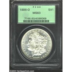 <TR><TD width="100%"><TABLE cellSpacing=1 cellPadding=3 width="100%" border=0><TBODY><TR><TD width="100%" bgColor=#79735c><FONT face=arial color=#ffffff size=3><B>Description</B> </FONT></TD></TR><TR><TD width="100%" bgColor=#ffffff><FONT face=arial size=2><B>1886-O $1 MS63 PCGS.</B></I> A nicely struck and moderately prooflike piece with untoned surfaces and an absence of bothersome luster grazes. Unlike most New Orleans issues from its era, the 1886-O is elusive in Uncirculated grades. </FONT></TD></TR></TBODY></TABLE></TD></TR></TBODY></TABLE><BR><A name=PricesRealized></A><TABLE cellSpacing=0 cellPadding=0 width="100%" bgColor=#000000 border=0><TBODY><TR><TD width="100%"><TABLE cellSpacing=1 cellPadding=3 width="100%" border=0><TBODY><TR><TD width="100%" bgColor=#79735c><A name=PR><FONT face=arial color=#ffffff size=3><B>Previous Prices from Heritage Auctions</B> </FONT></A></TD></TR><TR><TD bgColor=#f6f6ed><TABLE cellSpacing=0 cellPadding=0 width="100%" border=1><TBODY><TR><TD align=middle width="33%"><B>Date</B></TD><TD align=middle width="33%"><B>Service</B></TD><TD align=middle width="33%"><B>Price</B></TD></TR><TR bgColor=whitesmoke><TD width="33%"><B>01/11/2003</B></TD><TD width="33%">PCGS</TD><TD width="33%">$1,725.00</TD></TR><TR bgColor=whitesmoke><TD width="33%"><B>11/12/2002</B></TD><TD width="33%">PCGS</TD><TD width="33%">$1,782.50</TD></TR><TR bgColor=whitesmoke><TD width="33%"><B>03/01/2001</B></TD><TD width="33%">PCGS</TD><TD width="33%">$2,530.00</TD></TR><TR bgColor=whitesmoke><TD width="33%"><B>08/09/2000</B></TD><TD width="33%">PCGS</TD><TD width="33%">$2,185.00</TD></TR><TR bgColor=whitesmoke><TD width="33%"><B>01/01/2001</B></TD><TD width="33%">PCGS</TD><TD width="33%">$1,840.00</TD></TR><TR bgColor=whitesmoke><TD width="33%"><B>05/27/2001</B></TD><TD width="33%">PCGS</TD><TD width="33%">$1,495.00</TD></TR><TR bgColor=whitesmoke><TD width="33%"><B>07/30/2002</B></TD><TD width="33%">PCGS</TD><TD width="33%">$1,725.00</TD></TR><TR bgColor=whitesmoke><TD width="33%"><B>06/08/2002</B></TD><TD width="33%">PCGS</TD><TD width="33%">$2,415.00</TD></TR><TR bgColor=whitesmoke><TD width="33%"><B>04/27/2002</B></TD><TD width="33%">PCGS</TD><TD width="33%">$2,300.00</TD></TR><TR bgColor=whitesmoke><TD width="33%"><B>08/07/2000</B></TD><TD width="33%">PCGS</TD><TD width="33%">$2,530.00</TD></TR><TR bgColor=whitesmoke><TD width="33%"><B>06/07/2000</B></TD><TD width="33%">PCGS</TD><TD width="33%">$1,667.50</TD></TR><TR bgColor=whitesmoke><TD width="33%"><B>08/14/1999</B></TD><TD width="33%">PCGS</TD><TD width="33%">$2,185.00</TD></TR><TR bgColor=whitesmoke><TD width="33%"><B>03/22/1997</B></TD><TD width="33%">PCGS</TD><TD width="33%">$2,645.00</TD></TR><TR bgColor=whitesmoke><TD width="33%"><B>06/26/2001</B></TD><TD width="33%">PCGS</TD><TD width="33%">$2,000.00</TD></TR><TR bgColor=whitesmoke><TD width="33%"><B>02/01/1999</B></TD><TD width="33%">PCGS</TD><TD width="33%">$2,530.00</TD></TR><TR bgColor=whitesmoke><TD width="33%"><B>01/05/2001</B></TD><TD width="33%">PCGS</TD><TD width="33%">$1,725.00</TD></TR><TR bgColor=whitesmoke><TD width="33%"><B>02/12/2000</B></TD><TD width="33%">PCGS</TD><TD width="33%">$1,725.00</TD></TR><TR bgColor=whitesmoke><TD width="33%"><B>08/13/1999</B></TD><TD width="33%">PCGS</TD><TD width="33%">$2,760.00</TD></TR><TR bgColor=whitesmoke><TD width="33%"><B>11/12/1993</B></TD><TD width="33%">PCGS</TD><TD width="33%">$1,303.50</TD></TR><TR bgColor=whitesmoke><TD width="33%"><B>02/01/2000</B></TD><TD width="33%">PCGS</TD><TD width="33%">$2,645.00</TD></TR><TR bgColor=whitesmoke><TD width="33%"><B>03/01/1999</B></TD><TD width="33%">PCGS</TD><TD width="33%">$2,070.00</TD></TR><TR bgColor=whitesmoke><TD width="33%"><B>01/11/2003</B></TD><TD width="33%">NGC</TD><TD width="33%">$1,610.00</TD></TR><TR bgColor=whitesmoke><TD width="33%"><B>08/02/1997</B></TD><TD width="33%">NGC</TD><TD width="33%">$1,380.00</TD></TR><TR bgColor=whitesmoke><TD width="33%"><B>04/24/2001</B></TD><TD width="33%">NGC</TD><TD width="33%">$1,900.00</TD></TR><TR bgColor=whitesmoke><TD width="33%"><B>08/08/2001</B></TD><TD width="33%">NGC</TD><TD width="33%">$1,840.00</TD></TR><TR bgColor=whitesmoke><TD width="33%"><B>03/21/1998</B></TD><TD width="33%">NGC</TD><TD width="33%">$1,495.00</TD></TR><TR bgColor=whitesmoke><TD width="33%"><B>03/11/2003</B></TD><TD width="33%">NGC</TD><TD width="33%">$1,758.35</TD></TR></TBODY></TABLE></TD></TR><TR><TD bgColor=#ffffff><FONT face=arial size=1 ?>PLEASE NOTE: All prices realized reflect the final hammer price PLUS the buyer's premium in auctions that charge a buyer's premium. Each item has a notation at the top of the listing indicating whether that lot included a buyer's premium. Example: A item that sells with a final hammer price of $100 and a 20% buyer's premium will display with a price realized of $120. All information listed is intended to be as accurate as possible, but errors are possible. Please use this guide carefully and inform us of any inaccuracies. </FONT></TD></TR></TBODY></TABLE></TD></TR></TBODY></TABLE><BR><TABLE cellSpacing=0 cellPadding=0 width="100%" bgColor=#000000 border=0><TBODY><TR><TD width="100%"><TABLE cellSpacing=1 cellPadding=3 width="100%" border=0><TBODY><TR><TD width="100%" bgColor=#79735c colSpan=6><FONT face=arial color=#ffffff size=3><B>Price Guide*</B> </FONT></TD></TR><TR bgColor=#f6f6ed><TD align=middle><B>Grade</B> </TD><TD align=middle><B>Coin World<BR>(Trends)</B> </TD><TD align=middle><B>Numismedia<BR>Retail</B> </TD><TD align=middle><B>Numismedia<BR>Wholesale</B> </TD><TD align=middle><B>Coin<BR>Universe</B> </TD><TD align=middle><B>Heritage<BR>Value Index</B> </TD></TR><TR bgColor=#ffffff><TD align=middle>62</TD><TD align=right>$1,000.00</TD><TD align=right>---</TD><TD align=right>$875.00</TD><TD align=right>$1,050.00</TD><TD align=right>$844.81</TD></TR><TR style="FONT-WEIGHT: bold" bgColor=#cccfdd><TD align=middle>63</TD><TD align=right>$2,400.00</TD><TD align=right>---</TD><TD align=right>$2,22