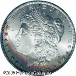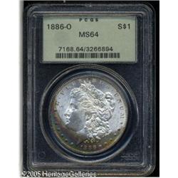 <B>1886-O<img border='0' src='http://www.heritagecoins.com/images/star.gif' width=10 height=10>$1 MS64 PCGS.</B></I> It is curious to note that although fewer 1883-O, 1884-O, and 1885-O Morgan Dollars were produced than the 1886-O, the latter issue is much more difficult to locate in the preferred levels of Uncirculated. The '86-O is all but unknown in strict Gem condition, which makes this near-Gem piece a desirable coin for the collector of high grade Morgans. The softly frosted surfaces are remarkably clean for this normally heavily abraded issue, with only a few slight luster grazes seen on the obverse. Brilliant except for a generous crescent of deep multicolored iridescence at the lower portion of the obverse. Population: 151 in 64, 3 finer (1/05).<BR><I>Ex: Premier Auction Sale (Superior, 1/95), lot 1026.</B></I><BR><I>From The Dr. Volker Dube Collection.</B></I> Lot:7241