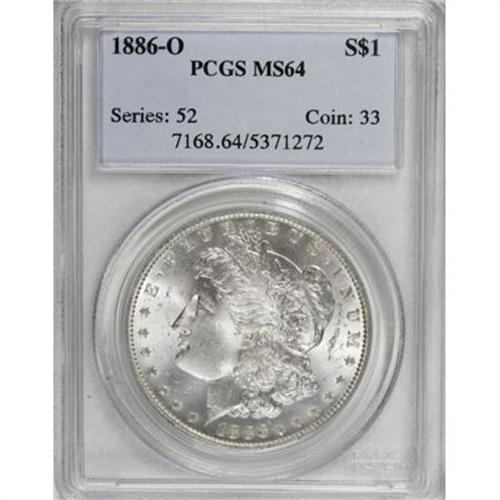 <B>1886-O $1 MS64 PCGS.</B></I> <B>1886-O S$1 MS64 PCGS.</B></I> This is an impressive example of the issue, with satiny silver surfaces and fully brilliant luster on both sides. The strike is sharp for the date, and the eye appeal is considerable for an '86-O. With 189 pieces certified at this grade level, the population certainly seems plentiful enough, but only three finer examples have been graded by PCGS (8/07). Therefore, nearly all collectors of otherwise Gem quality collections must necessarily choose a near-Gem specimen of this date.<BR><BR><B>Coin Engraver:</B> George T. Morgan<BR><BR><b>Shipping:</b> Coins & Currency (<a target="_blank" href="http://www.heritageauctions.com/common/shipping.php">view shipping information</a>)