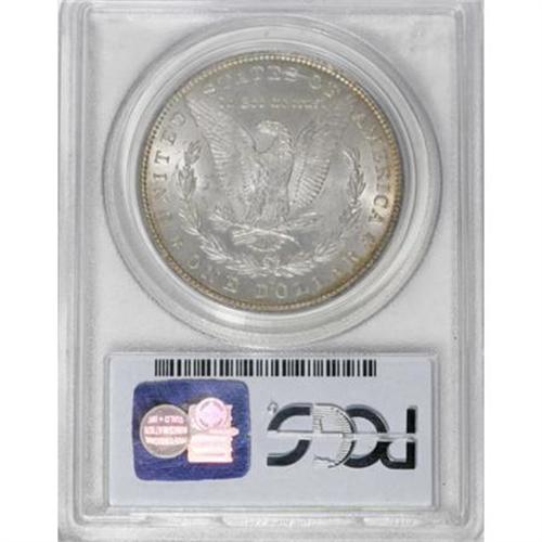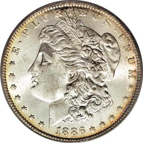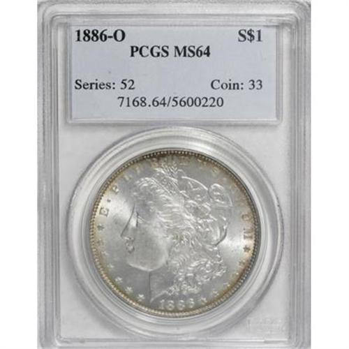 <B>1886-O $1 MS64 PCGS.</B></I> One of the true conditional rarities in the Morgan dollar series, the 1886-O is frequently seen in circulated grades but is highly elusive in Choice to Gem condition. Most examples were apparently paid out at the time of issue, or else melted under the Pittman Act of 1918. Although NGC and PCGS combined have certified nearly 300 pieces in MS64, the Gem population falls off the cliff--a scant four coins, making the MS64s about as nice as can be easily obtained. <BR> This frosty example is simply a tremendous coin, offering silver centers that complement a ring of gold at the margins on each side, with a passable strike for the issue. A couple of marks on the reverse of the plastic slab should not be confused for an impairment on the coin. Bowers' Morgan dollar <I>Guide Book </B></I>rates the Optimal Collecting Grade for this issue as MS63. In MS64, this piece represents tremendous numismatic value as well as aesthetic quality--and an MS65 piece, if one could be found, would cost well into the six-figure range.<BR><I>From The Jimmy G. PCGS Registry Collection of Morgan Dollars with Varieties.</B></I><BR><BR><B>Coin Engraver:</B> George T. Morgan<BR><BR><b>Shipping:</b> Coins & Currency (<a target="_blank" href="http://www.heritageauctions.com/common/shipping.php">view shipping information</a>)