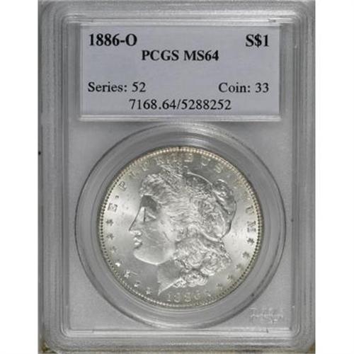 <B>1886-O $1 MS64 PCGS.</B></I> Bright, satiny luster characterizes this challenging O-mint dollar. Usually found in lower grades, this is an impressive near-Gem. Sharply struck in the centers, also an unusual attribute for this issue. The surfaces are lightly abraded and there is no trace of toning on either side.<BR><BR><B>Coin Engraver:</B> George T. Morgan<BR><BR><b>Shipping:</b> Coins & Currency (<a target="_blank" href="http://www.heritageauctions.com/common/shipping.php">view shipping information</a>)