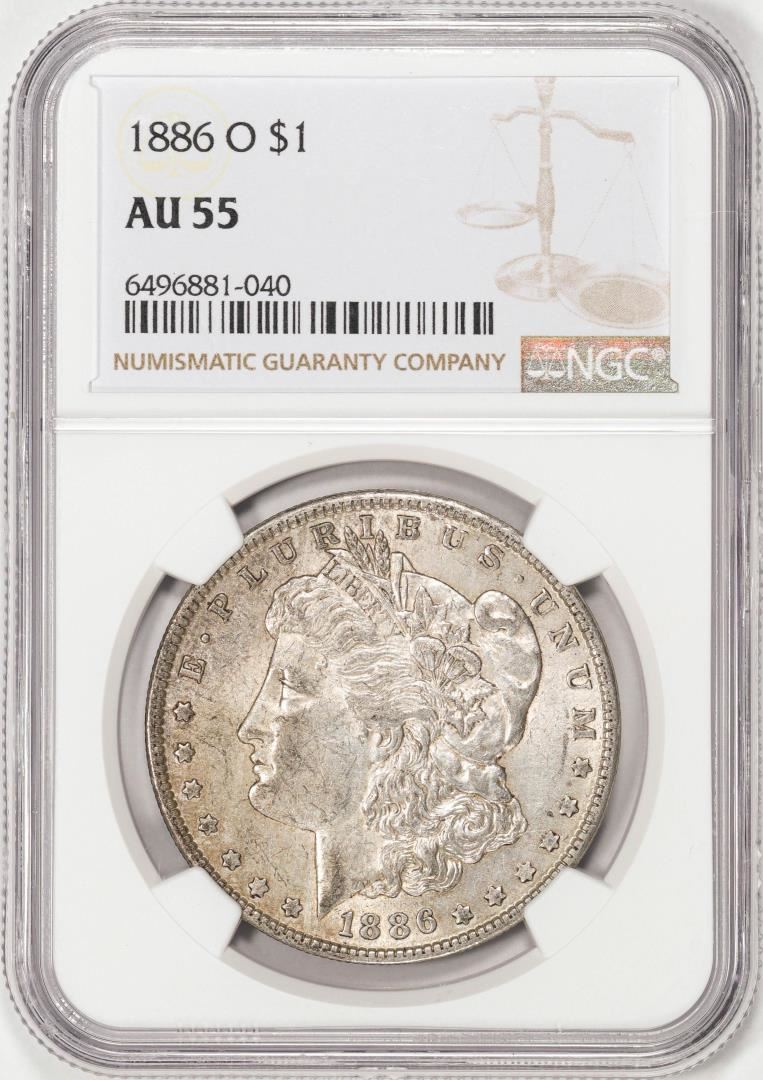 One 1886-O $1 Morgan Silver Dollar Coin NGC AU55. NGC Certified.