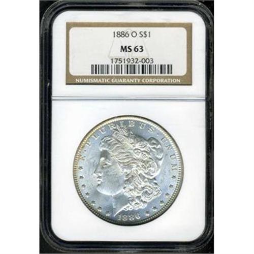 <b>1886-O Morgan Dollar. NGC graded MS63.</b> One small nick on the throat, a couple of equally slight marks on the cheek. What's more, this is unusually well struck for this conditionally scarcer New Orleans issue, with lustrous, untoned surfaces and the normal quota of scattered contact marks <b>(PCGS # 7168)</b>