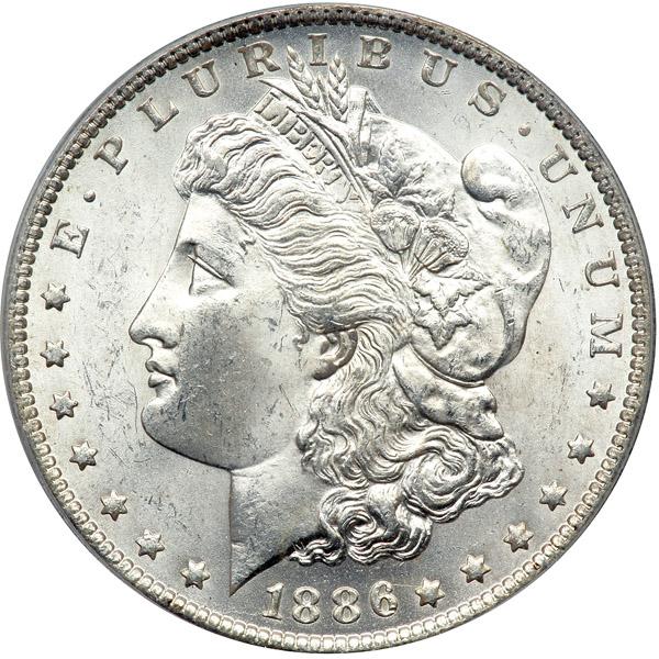This date should be common but it is not. The mintage was over 10 million coins, which makes it hard to believe more don't exist in Mint State grades. After all, the 1881-S issue had comparable mintage, yet well over a million examples of that date are known in Mint State grades (due to the immense hoard found in the Continental Bank vaults in 1984). David Bowers speculates in his Silver Dollars and Trade Dollars of the United States (1993): "At or near the time of striking in the nineteenth century, probably a few million coins, say two to four million, were placed into circulation and saw commercial use. Probably, millions of other coins, perhaps as many as six to eight million pieces, went to the melting pot under the terms of the 1918 Pittman Act." Recent grading statistics prove that in MS64 grade it is difficult to locate. In MS65 preservation the 1886-O happens to be the rarest New Orleans Mint Morgan dollar! The dramatic difference in the number of survivors between MS64 and MS65 is reflected in various auction results and price guides. We expect this fine example will bring near-record bidding from astute purchasers. Pop 213; 6 finer, 3 in 64+, 2 in 65, 1 in 65+ (PCGS # 7168) .