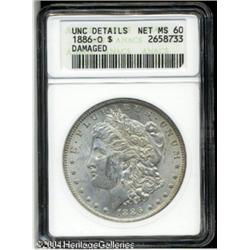 1886-O S$1 --Damaged--ANACS. Unc Details, Net MS60. <B>1886-O S$1 --Damaged--ANACS. Unc Details, Net MS60.</B></I> The cheek has a scrape and a vertical scratch, and these limit the grade of this conditionally rare New Orleans issue. Sharply struck, lightly toned, and fully lustrous. <BR><BR><B>Important notice:</B> Heritage usually auctions material at the rate of 200-250 lots per hour. On some occasions eBay Live bid software or the Internet may not be able to keep up with the pace of the auction. We recommend placing a realistic absentee bid now as insurance to avoid disappointment. Occasionally the auctioneer may eliminate or reject an eBay Live bid, and the auctioneer may also reopen a lot after the close of the eBay live bidding (usually because we missed an audience bid), and may reject your bid even if it shows you as the winning bidder. By bidding via eBay Live, you agree that Heritage may award the lot to another bidder at its sole discretion under the circumstances described above or any other reasonable circumstances. Since eBay bids are not shown to us until we open the lot on the floor, we treat those bids just like floor bids. In most cases the floor responds before the eBay bid is presented to us, due to Internet lag time, so for consistency we have made it a policy that floor bids are always considered first over tie eBay live bids. Also please note that all Heritage lots purchased through eBay Live carry a 20% Buyer's Premium. Please make sure you read the Terms and Conditions before you bid. This lot is being auctioned in conjunction with a live floor auction by Heritage Galleries & Auctioneers. All final auction and invoice information will be supplied by Heritage Galleries & Auctioneers, and all other information should be considered preliminary. Lot:7528