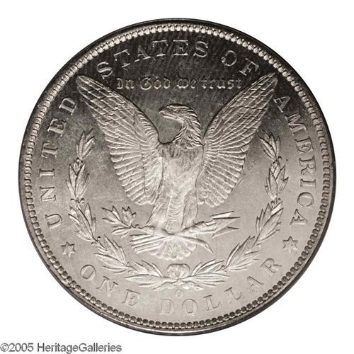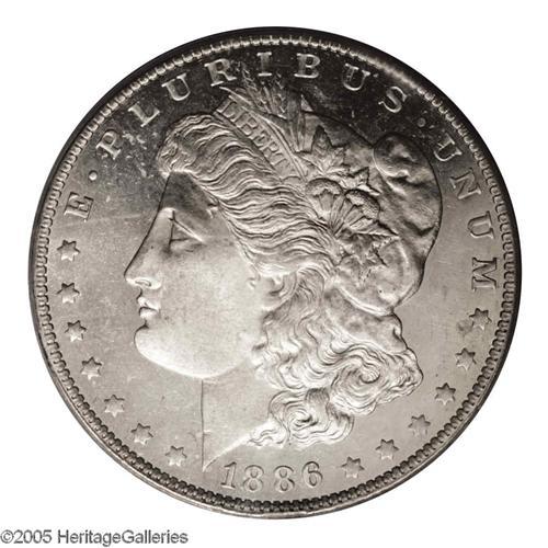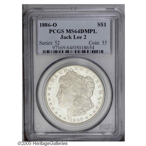 <B>1886-O<S$1> MS 64 Deep Mirror Prooflike PCGS.</B></I> Ex: Jack Lee 2. Although produced in substantial numbers, its mintage exceeding 10 million pieces, the vast majority of 1886-O Morgans were either placed in circulation or fell victim to Pittman Act meltings. Consequently, this once-overlooked New Orleans issue is now more accurately regarded as one of the more difficult O-mints in the series at the Uncirculated level. With mirrored fields, the 1886-O emerges as an exceedingly rare coin. Probably no more than two dozen Deep Mirror Prooflikes exist in all grades. This piece is sharply defined in all areas, being just a strand or two short of full over Liberty's ear, and shows heavy mint frost on the devices that provides a distinct cameo contrast. Only the slightest golden patina is visible over the fragile surfaces and precious few blemishes can be found in the fields, these invariably being scattered and insignificant. This extraordinary New Orleans dollar is high on the list of DMPL '86-O Morgans, most certainly ranking in the top four or five pieces in this very select field. Population: 3 in 64, 1 finer (11/05).