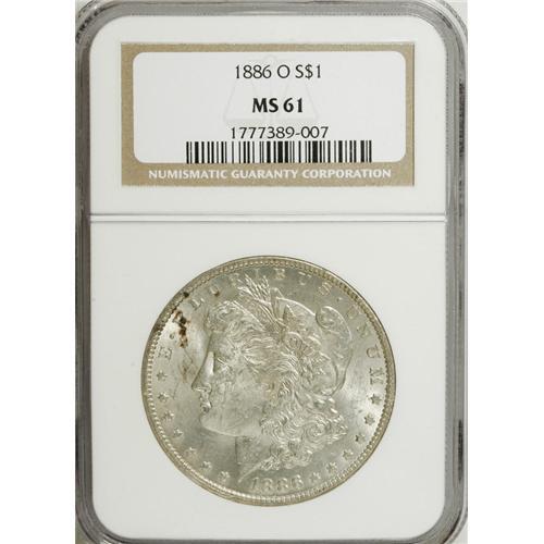 1886-O S$1 MS61 NGC. The 1886-O is common in VF, as ex