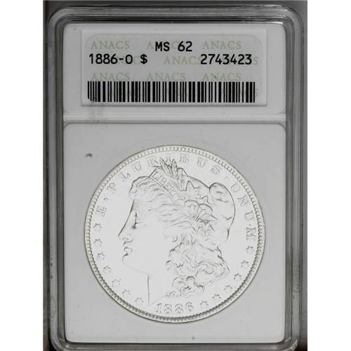 <B>1886-O<img border='0' src='http://www.heritagecoins.com/images/star.gif' width=10 height=10>$1> MS62 ANACS.</B></I> Lustrous, colorless example with some strike weakness especially on the reverse center. Reasonably well preserved, though several contact marks and luster grazes are seen on Liberty's cheek. <BR><BR><B>Important notice:</B> Heritage usually auctions material at the rate of 200-250 lots per hour. On some occasions eBay Live bid software or the Internet may not be able to keep up with the pace of the auction. We recommend placing a realistic absentee bid now as insurance to avoid disappointment. Occasionally the auctioneer may eliminate or reject an eBay Live bid, and the auctioneer may also reopen a lot after the close of the eBay live bidding (usually because we missed an audience bid), and may reject your bid even if it shows you as the winning bidder. By bidding via eBay Live, you agree that Heritage may award the lot to another bidder at its sole discretion under the circumstances described above or any other reasonable circumstances. Since eBay bids are not shown to us until we open the lot on the floor, we treat those bids just like floor bids. In most cases the floor responds before the eBay bid is presented to us, due to Internet lag time, so for consistency we have made it a policy that floor bids are always considered first over tie eBay live bids. Also please note that all Heritage lots purchased through eBay Live carry a 20% Buyer's Premium. Please make sure you read the Terms and Conditions before you bid. This lot is being auctioned in conjunction with a live floor auction by Heritage Galleries & Auctioneers. All final auction and invoice information will be supplied by Heritage Galleries & Auctioneers, and all other information should be considered preliminary. Lot:3458 <BR><BR><B>Winning Notification and Billing:</B> After the FINAL session in this auction is complete, Heritage will send e-mail and snail mail invoices. This process normally takes several days. All final auction and invoice information will be supplied by Heritage Galleries & Auctioneers, and all other information should be considered preliminary. <BR><BR>This auction will be conducted on a live auction floor and over the Internet through eBay Live. If you choose to place an absentee bid, please take a moment to <font color='#0000ff'><u><a href='http://pages.ebay.com/liveauctions/help/before/laabsentee.html'>learn how eBay Live absentee bidding works</a></u></font><font color='#000000'>