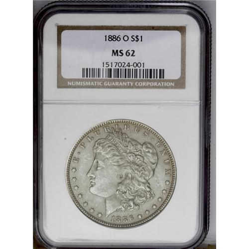 <B>1886-O<img border='0' src='http://www.heritagecoins.com/images/star.gif' width=10 height=10>$1> MS62 NGC.</B></I> This example has a muted gray-gold luster, with a weak strike through the centers and some roller marks seen on the obverse highpoints. There are few singular abrasions.