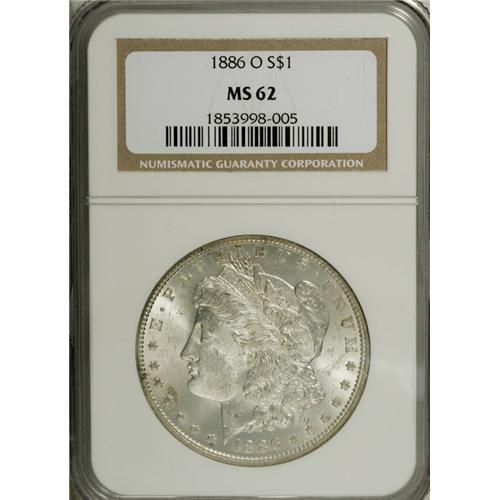 <B>1886-O S$1 MS62 NGC.</B></I> This lustrous New Orleans dollar has unusually strong detail and delicate lilac-gold toning near the rims. Scattered abrasions and three reeding marks on the cheek account for the grade.<BR><BR><b>Shipping:</b> Coins & Currency (<a target="_blank" href="http://www.heritageauctions.com/common/shipping.php">view shipping information</a>)