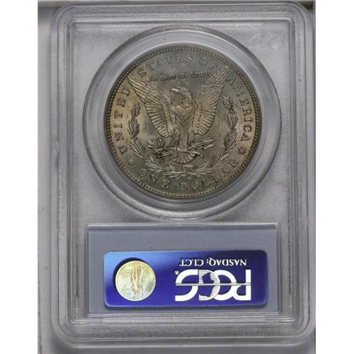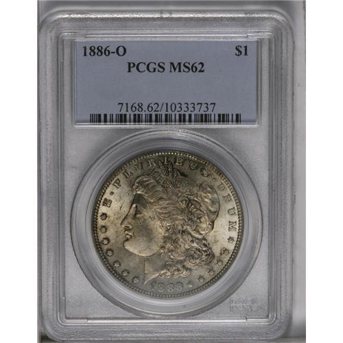 <B>1886-O<img border='0' src='http://www.heritagecoins.com/images/star.gif' width=10 height=10>$1> MS62 PCGS.</B></I> Kelly green and sienna pair in the light patina and darken around the stars and letters. Luster and strike are typical for the issue.