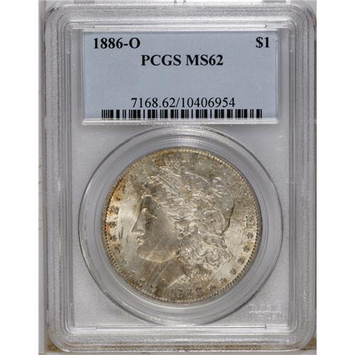 <B>1886-O S$1 MS62 PCGS.</B></I> The russet-gray patina that covers most of the obverse is fainter on the reverse. Softly lustrous and typically struck with isolated but significant abrasions on each side.<BR><BR><b>Shipping:</b> Coins & Currency (<a target="_blank" href="http://www.heritageauctions.com/common/shipping.php">view shipping information</a>)
