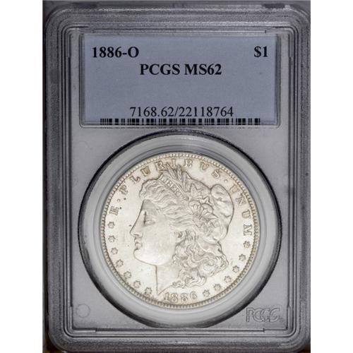 <B>1886-O<img border='0' src='http://www.heritagecoins.com/images/star.gif' width=10 height=10>$1> MS62 PCGS.</B></I> Traces of olive-tan color adhere to some of the peripheral areas, most noticeably on the obverse, and sharp definition characterizes the design elements. Liberty's cheek reveals some minute contact and slide marks.. <BR><BR><B>Important notice:</B> Heritage usually auctions material at the rate of 200-250 lots per hour. On some occasions eBay Live bid software or the Internet may not be able to keep up with the pace of the auction. We recommend placing a realistic absentee bid now as insurance to avoid disappointment. Occasionally the auctioneer may eliminate or reject an eBay Live bid, and the auctioneer may also reopen a lot after the close of the eBay live bidding (usually because we missed an audience bid), and may reject your bid even if it shows you as the winning bidder. By bidding via eBay Live, you agree that Heritage may award the lot to another bidder at its sole discretion under the circumstances described above or any other reasonable circumstances. Since eBay bids are not shown to us until we open the lot on the floor, we treat those bids just like floor bids. In most cases the floor responds before the eBay bid is presented to us, due to Internet lag time, so for consistency we have made it a policy that floor bids are always considered first over tie eBay live bids. Also please note that all Heritage lots purchased through eBay Live carry a 20% Buyer's Premium. Please make sure you read the Terms and Conditions before you bid. This lot is being auctioned in conjunction with a live floor auction by Heritage Galleries & Auctioneers. All final auction and invoice information will be supplied by Heritage Galleries & Auctioneers, and all other information should be considered preliminary. Lot:3457 <BR><BR><B>Winning Notification and Billing:</B> After the FINAL session in this auction is complete, Heritage will send e-mail and snail mail invoices. This process normally takes several days. All final auction and invoice information will be supplied by Heritage Galleries & Auctioneers, and all other information should be considered preliminary. <BR><BR>This auction will be conducted on a live auction floor and over the Internet through eBay Live. If you choose to place an absentee bid, please take a moment to <font color='#0000ff'><u><a href='http://pages.ebay.com/liveauctions/help/before/laabsentee.html'>learn how eBay Live absentee bidding works</a></u></font><font color='#000000'>