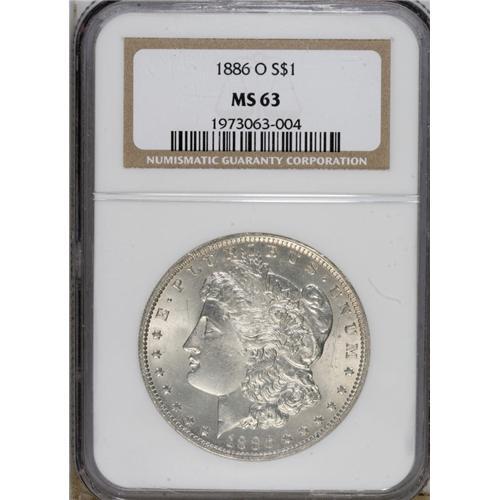 <B>1886-O S$1 MS63 NGC.</B></I> All Morgan dollar issues fall into one of four general categories combining mintage and survival. This date is in the high mintage and low survival category. It seems that most 10 million coins minted went into circulation, or they were melted. A Select Mint State example, this piece has frosty silver luster with faint gold toning near the borders.<BR><BR><b>Shipping:</b> Coins & Currency (<a target="_blank" href="http://www.heritageauctions.com/common/shipping.php">view shipping information</a>)