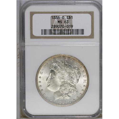 <B>1886-O<img border='0' src='http://www.heritagecoins.com/images/star.gif' width=10 height=10>$1> MS63 NGC.</B></I> Boldly struck with rich, frosty luster and untoned fields and central devices surrounded by a pleasing slight band of rose coloration at the peripheries. Wispy marks on Liberty's cheek and in the left obverse field limit the grade. A scarcer date in Uncirculated condition.