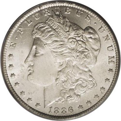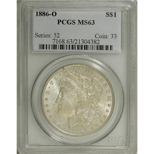 <B>1886-O S$1 MS63 PCGS.</B></I> A conditionally rare issue in Mint State, the 1886-O usually suffers from poor luster and strike quality. On the present piece, the luster is far above average, with some cartwheel effect, if not in the same class as the most outstanding S-mint issues. The strike is also passable, with some weakness on the hair over the ear and decent detailing on the eagle's breast feathers.<BR><BR><b>Shipping:</b> Coins & Currency (<a target="_blank" href="http://www.heritageauctions.com/common/shipping.php">view shipping information</a>)