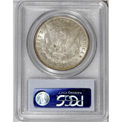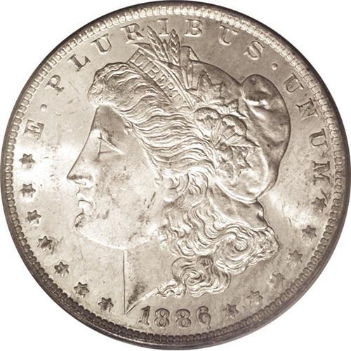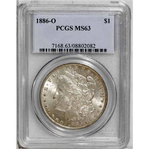 <B>1886-O<img border='0' src='http://www.heritagecoins.com/images/star.gif' width=10 height=10>$1> MS63 PCGS.</B></I> A nicely struck example of this typically weak O-mint issue. Lightly toned in a somewhat mottled silver-gray haze. Scattered minor abrasions define the grade. This date is very elusive and valuable as it moves up from the MS60 grade. A great coin for the advanced Morgan dollar collector.