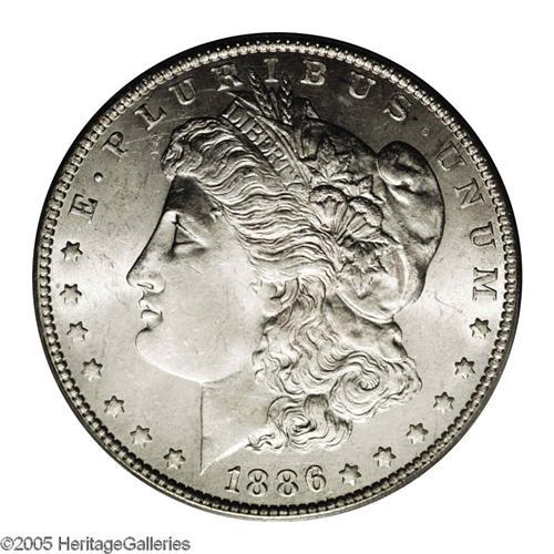 <B>1886-O<S$1> MS63 PCGS.</B></I> A nicely struck example that has good luster and relatively clean surfaces. The cheek has very faint roller marks, as made. The 1886-O has a mintage above 10 million pieces, and its origin, the New Orleans Mint, has a reputation for common Mint State issues. It thus comes a surprise to the intermediate Morgan collector that while the 1886-O is frequently found in VF grades, attractive Mint State examples are very scarce, and Gems are essentially unobtainable.