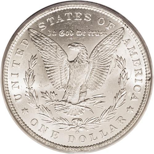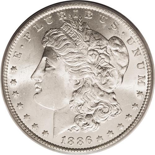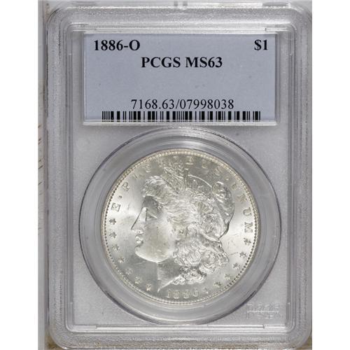 <B>1886-O<img border='0' src='http://www.heritagecoins.com/images/star.gif' width=10 height=10>$1> MS63 PCGS.</B></I> A truly rare coin in the higher Mint State grades, the 1886-O is quite common in circulated condition. It took the advent of certified grading to establish how elusive the top Uncirculated pieces are. This specimen offers brilliant, untoned surfaces with good cartwheel luster. A few light reeding marks and abrasions determine the grade, but the eye appeal is considerable, and there are no singular distractions.