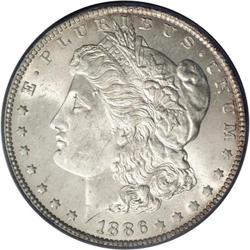 <B>1886-O<img border='0' src='http://www.heritagecoins.com/images/star.gif' width=10 height=10>$1 MS63 PCGS.</B></I> Most New Orleans issues in the Morgan dollar series are reasonably common, the exceptions being the 1886-O and the 1893-97 issues. Many years ago, nearly all New Orleans coins were considered rarities, but in the 1960s the Treasury released large hoards of them. The 1886-O was one of a few issues that were largely omitted from that release, and it remains rare today. The choice, eye-appealing example offered here is fully lustrous, with light champagne toning and a few surface that limit a higher grade. For the issue, MS63 is the optimum grade, above which it becomes quite expensive.