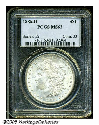 <B>1886-O<S$1> MS63 PCGS.</B></I> The 1886-O is a scarce issue despite a substantial mintage that exceeded 10 million coins. Although the lowest Mint State grades are generally available, examples at or near the Choice Mint State level are elusive. This attractive and sharply struck example has lustrous silver surfaces and good eye appeal. Population: 373 in 63, 161 finer (6/05).