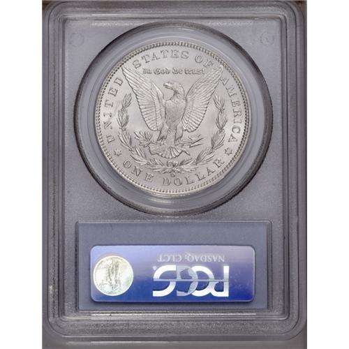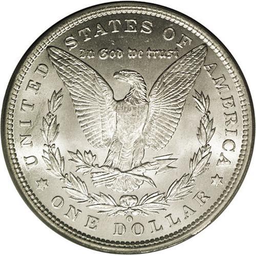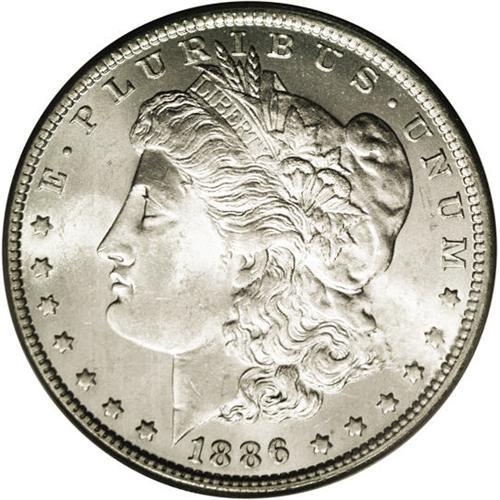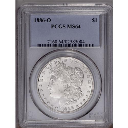 <B>1886-O<img border='0' src='http://www.heritagecoins.com/images/star.gif' width=10 height=10>$1> MS64 PCGS.</B></I> Despite a mintage exceeding 10 million pieces, this issue is decidedly scarce in the higher Mint State grades. Fewer than 300 examples have been certified by PCGS and NGC in near-Gem condition, and a paltry four pieces finer (2/06). This example has a few light marks on the cheek and a small unobtrusive shallow scrape through the eagle's right (facing) wing, noted under a glass, that limit the grade on this highly appealing coin. The design elements offer a better-than-normal strike, though minor weakness is noted in the hair over Liberty's ear. The silvery-gray surfaces project a semi-frosty appearance.
