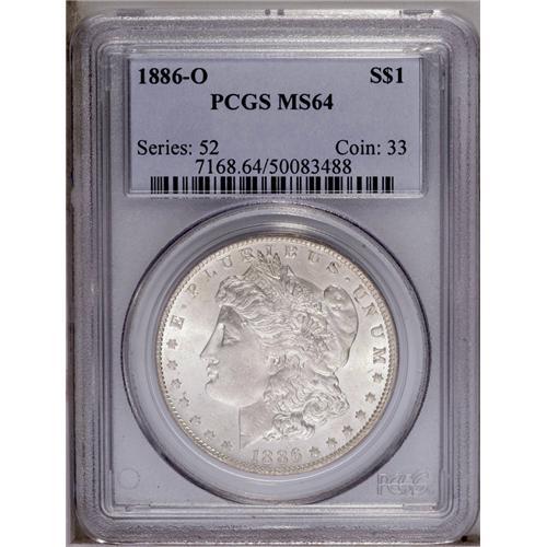 <B>1886-O<img border='0' src='http://www.heritagecoins.com/images/star.gif' width=10 height=10>$1> MS64 PCGS.</B></I> In the <I>Red Book of Morgan Dollars,</B></I> author Dave Bowers suggested: "Striking varies from flat at the centers to fairly sharp, with most being quite decent. Cherrypicking is advised, to the extent that it can be done among Mint State coins, which are not often encountered. The lustre on the 1886-O ranges from flat, grainy, and lifeless to fairly frosty, the last being in the distinct minority. Again, cherrypicking is advised, but this must be done over a period of time, as one certainly does not have the opportunity to view a significant group of 1886-O dollars side by side." This Choice example has frosty silver luster with good design definition. The surfaces are brilliant with silvery-white coloration. Exceedingly rare any finer. <BR><BR><B>Important notice:</B> Heritage usually auctions material at the rate of 200-250 lots per hour. On some occasions eBay Live bid software or the Internet may not be able to keep up with the pace of the auction. We recommend placing a realistic absentee bid now as insurance to avoid disappointment. Occasionally the auctioneer may eliminate or reject an eBay Live bid, and the auctioneer may also reopen a lot after the close of the eBay live bidding (usually because we missed an audience bid), and may reject your bid even if it shows you as the winning bidder. By bidding via eBay Live, you agree that Heritage may award the lot to another bidder at its sole discretion under the circumstances described above or any other reasonable circumstances. Since eBay bids are not shown to us until we open the lot on the floor, we treat those bids just like floor bids. In most cases the floor responds before the eBay bid is presented to us, due to Internet lag time, so for consistency we have made it a policy that floor bids are always considered first over tie eBay live bids. Also please note that all Heritage lots purchased through eBay Live carry a 20% Buyer's Premium. Please make sure you read the Terms and Conditions before you bid. This lot is being auctioned in conjunction with a live floor auction by Heritage Galleries & Auctioneers. All final auction and invoice information will be supplied by Heritage Galleries & Auctioneers, and all other information should be considered preliminary. Lot:3459 <BR><BR><B>Winning Notification and Billing:</B> After the FINAL session in this auction is complete, Heritage will send e-mail and snail mail invoices. This process normally takes several days. All final auction and invoice information will be supplied by Heritage Galleries & Auctioneers, and all other information should be considered preliminary. <BR><BR>This auction will be conducted on a live auction floor and over the Internet through eBay Live. If you choose to place an absentee bid, please take a moment to <font color='#0000ff'><u><a href='http://pages.ebay.com/liveauctions/help/before/laabsentee.html'>learn how eBay Live absentee bidding works</a></u></font><font color='#000000'>
