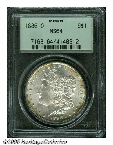 <B>1886-O<S$1> MS64 PCGS.</B></I> Perhaps no other issue in the Morgan Dollar series has less correlation between mintage and availability in high grades. Despite a production of more than 10 million pieces, the '86-O is one of the most challenging O-mints in better Uncirculated grades. This satiny representative is virtually untoned, save for some golden-brown highlights at selected portions of the obverse and reverse border. Outstanding strength of strike shows in the centers. Population: 154 in 64, 3 finer (3/05).<BR><I>From The Milwaukee Shore Collection.</B></I>