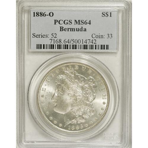 <B>1886-O S$1 MS64 PCGS.</B></I> The strike is considerably above-average on this notable condition rarity. Both the hair above Liberty's ear and particularly the eagle's breast show a wealth of pleasing detail. The luster is also superior, with radiant cartwheels showing over the untoned, brilliant surfaces. Bowers' <I>Guide Book of Morgan Silver Dollars</B></I> advises cherrypicking, and forthright collectors would be well advised to cherrypick this example. PCGS has certified only three Gems of this issue as of (4/07) and it is likely that those pieces rest in strong hands, making this piece essentially among the finest obtainable.<BR><BR><b>Shipping:</b> Coins & Currency (<a target="_blank" href="http://www.heritageauctions.com/common/shipping.php">view shipping information</a>)