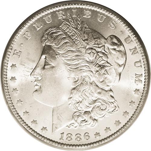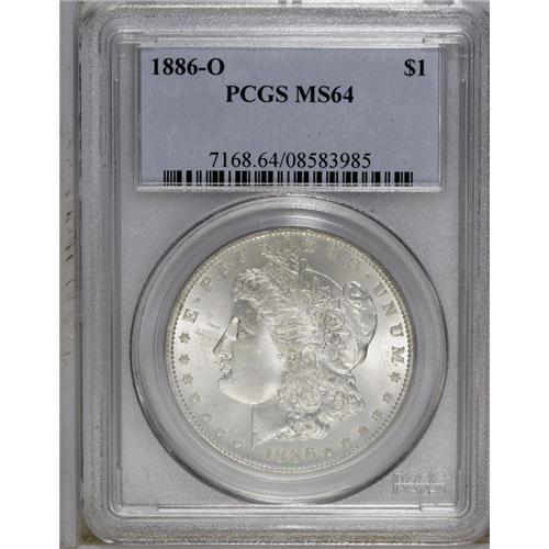<B>1886-O<img border='0' src='http://www.heritagecoins.com/images/star.gif' width=10 height=10>$1> MS64 PCGS.</B></I> This attractive silver dollar is untoned and displays a lovely, softly frosted sheen over both sides. Generally well struck, with only slight weakness noted just above Liberty's ear, but good definition on the eagle's breast feathers. A few mild abrasions preclude the Gem grade assessment. PCGS has certified only three examples of this New Orleans Mint issue at MS65, with none any finer (9/06).