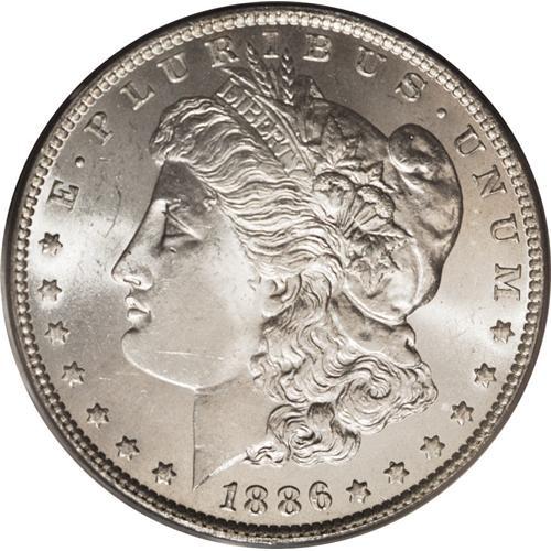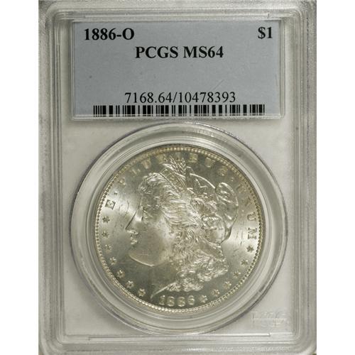<B>1886-O S$1 MS64 PCGS.</B></I> This is a sharply struck and fully lustrous near-Gem specimen of the all-important 1886-O Morgan dollar, a condition rarity that is seldom found any finer. In fact, only four higher-grade pieces have been certified by PCGS and NGC (2/07). Nearly untoned, save for a few barely discernible wisps of color here and there. Some light, inoffensive marks define the grade.<BR><BR><b>Shipping:</b> Coins & Currency (<a target="_blank" href="http://www.heritageauctions.com/common/shipping.php">view shipping information</a>)