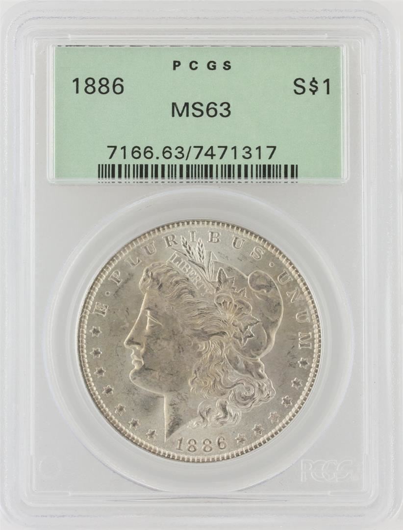 One 1886 PCGS MS63 Morgan Silver Dollar. PCGS Certified.