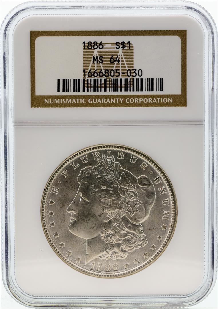 One 1886 PCGS MS64 Morgan Silver Dollar.