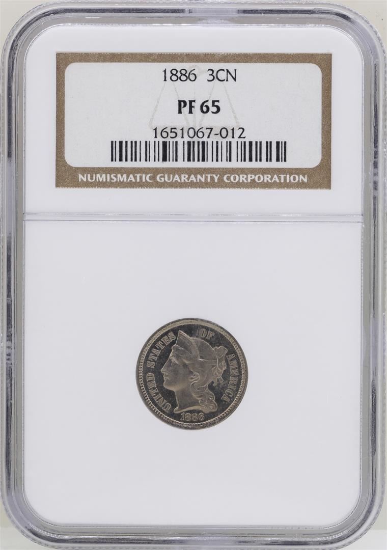 One 1886 Proof 3 Cent Nickel Coin NGC PF65. NGC Certified.