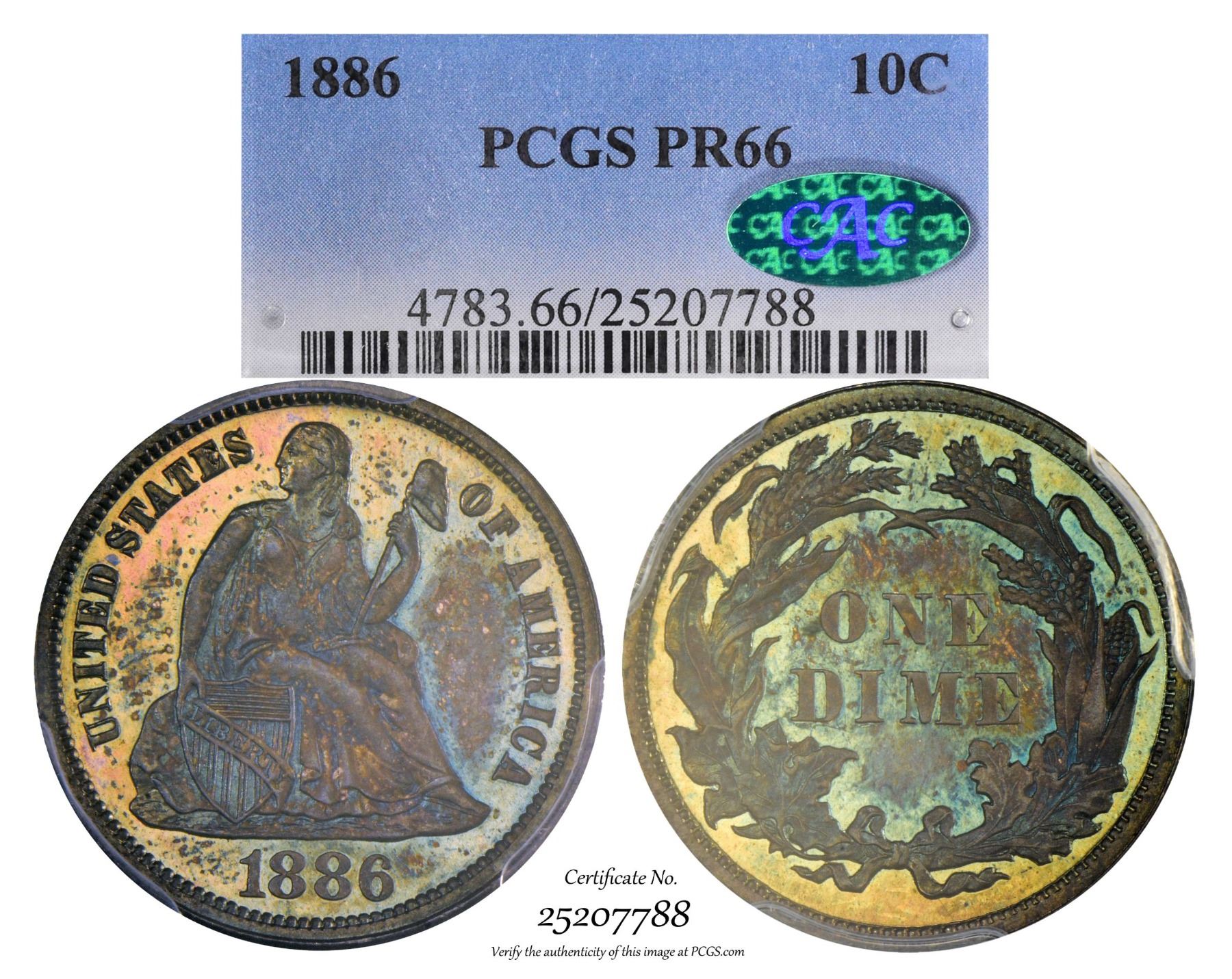 One 1886 Proof Seated Liberty Dime Coin Arrows PCGS PR66 CAC Amazing Toning.